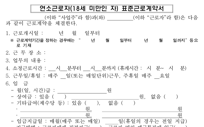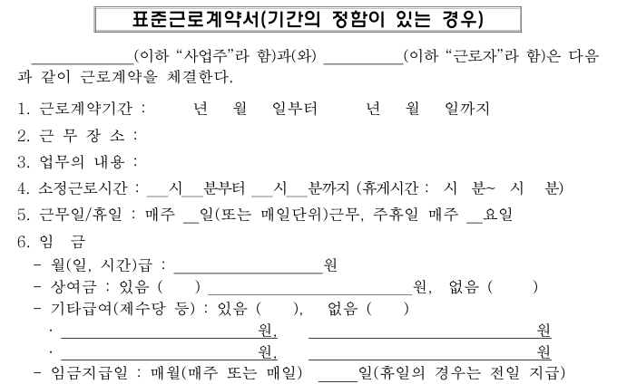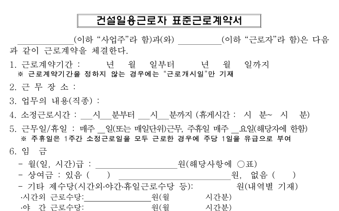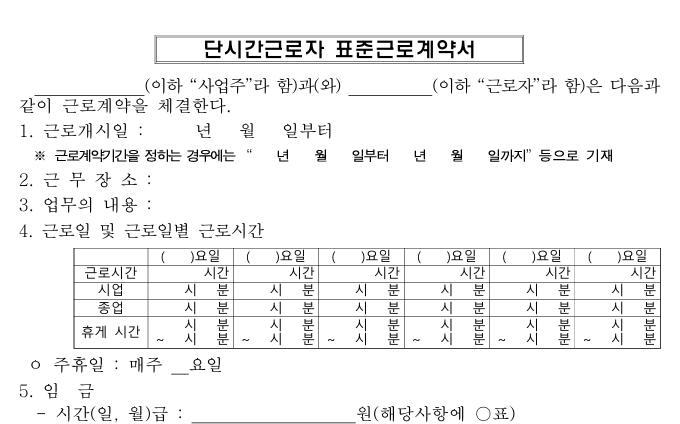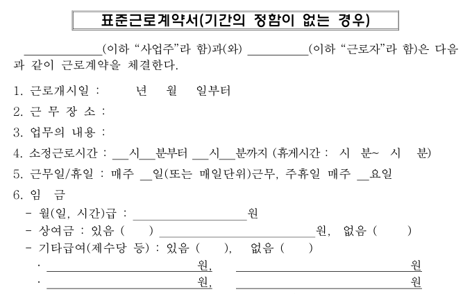 - 고용노동부 공식 홈페이지에서 다양한 형태의 표준 근로계약서 양식을 다운로드할 수 있습니다.
